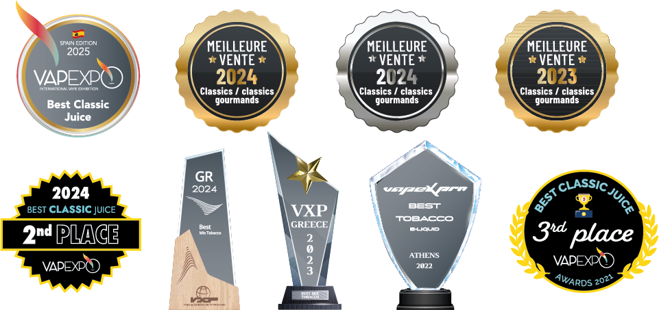 Nos e-liquides ont remporté plusieurs prix à l’international et sont soulignés partout pour leur apport à l’industrie du vapotage. En seulement deux ans sur le marché européen, nos e-liquides ont remporté trois prix prestigieux dans l’industrie du vapotage.